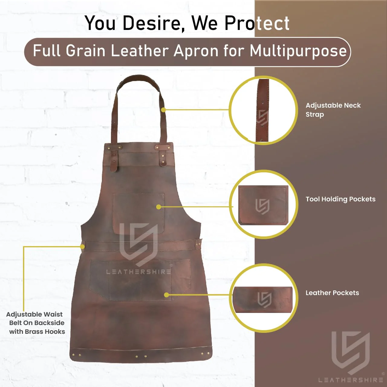 This apron is a top choice for those who adore luxury items. It's crafted from thick and long-lasting cowhide leather, featuring a rare distressed stonewash appearance that's a gem in real leather. Rest assured, the quality of this apron will exceed your expectations!