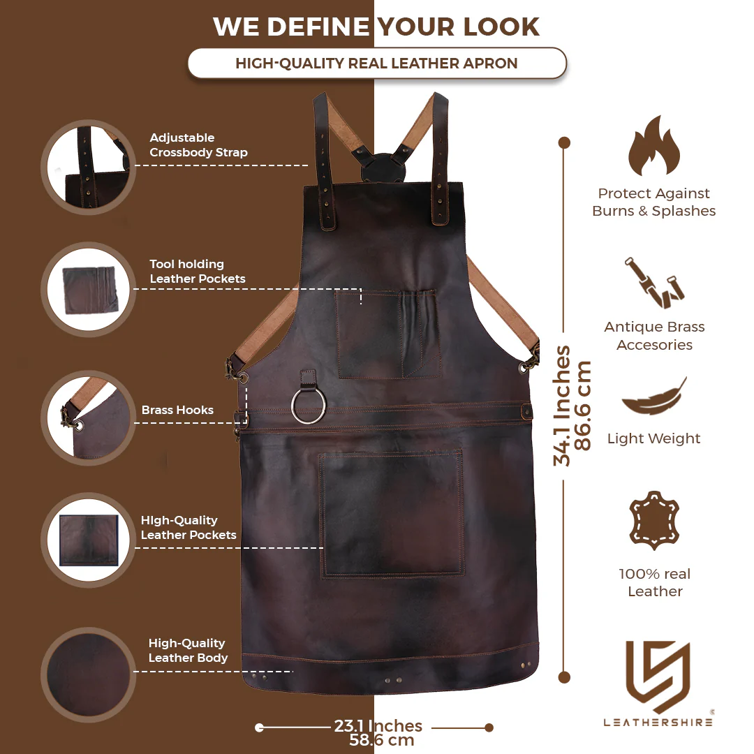 This apron is a top choice for those who adore luxury items. It's crafted from thick and long-lasting cowhide leather, featuring a rare distressed stonewash appearance that's a gem in real leather. Rest assured, the quality of this apron will exceed your expectations!